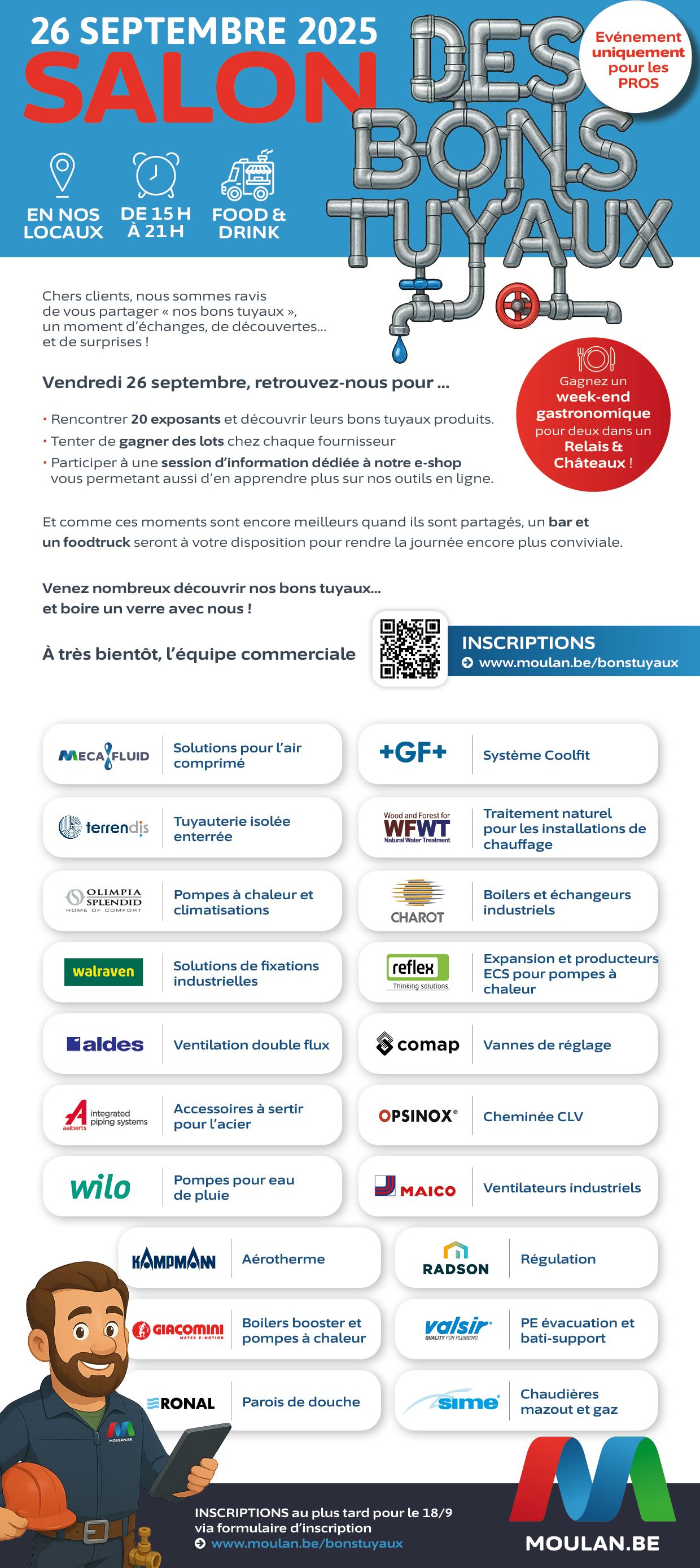 Le salon, destiné aux professionnels, se tiendra ce vendredi 26 septembre dans les locaux de la société Moulan (à Chaineux). Vous pourrez nous y retrouver afin que nous vous partagions nos bons tuyaux dans nos différents domaines d'activité et plus spécifiquement pour vos centrales d'air comprimé.
