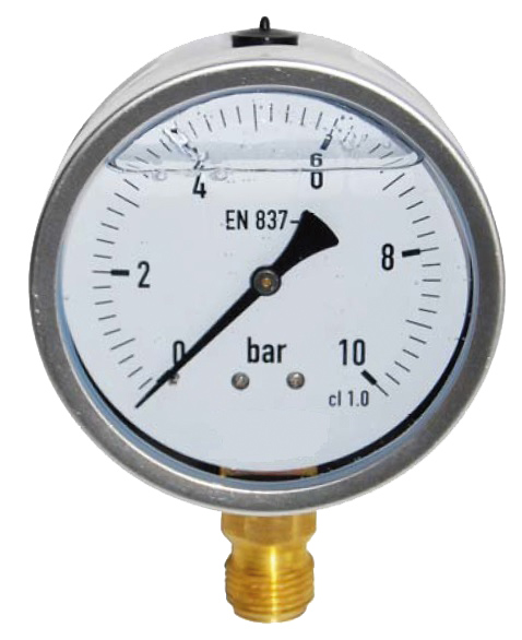 Manomètre - Raccord en laiton Au bas / Radial - Boîtier en Inox 304 - Avec glycérine - Diamètre raccordement: 1/2'' - Plage de pression: (-1)-0bar - Diamètre cadran: 100mm - Classe de précision: 1