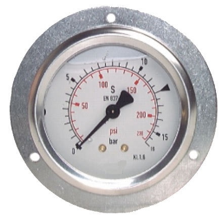 Manomètre - Raccord en laiton Au dos / Radial avec collerette avant - Boîtier en Inox 304 - Avec glycérine - Diamètre raccordement: 1/2'' - Plage de pression: (-1)-0bar - Diamètre cadran: 100mm - Classe de précision: 1